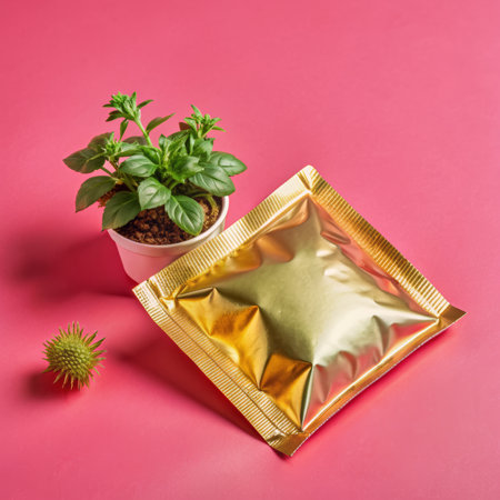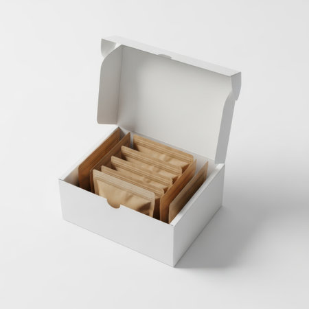 Herbal supplement box with open sachets, blank side for label, minimal setup with herbal leaves on light backdrop