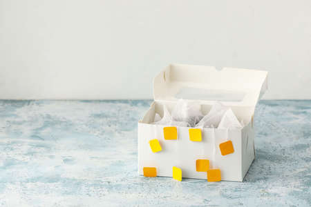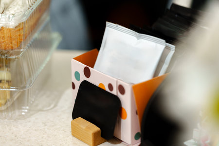 Colorful box of tea bags on a countertop in a cozy cafe setting during the afternoon
