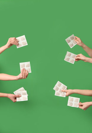 Pattern of paper filter bags for drip coffee on a green background with shadow.