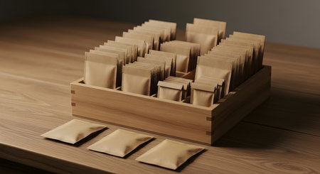 A wooden crate is filled with many small brown paper packets, arranged neatly. Three packets are placed in front of the crate on a wooden surface.