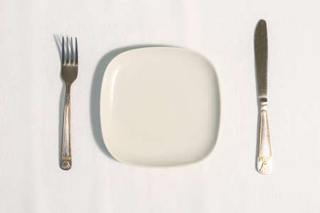 Empty plate with fork, cutlery for dinner table. Kitchen empty plate for meals