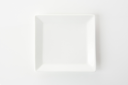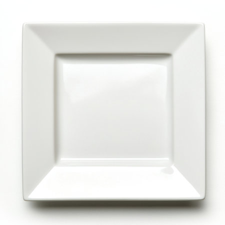 A sleek, modern square white plate positioned on a bright background. This minimalist design is perfect for showcasing culinary creations and enhancing dining experiences.