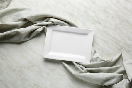 Food background. White empty plate, napkin on stone gray background. Top view, flatlay, copyspace.