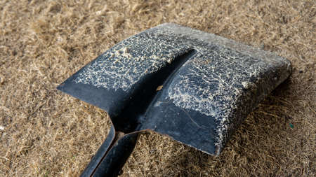 Close up detail view of dirty shovel on the ground. It is a hand tool for digging, lifting, and moving bulk materials, such as soil, coal, gravel, snow, sand, or ore.