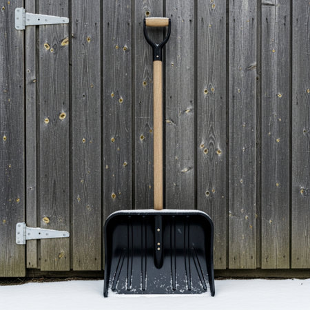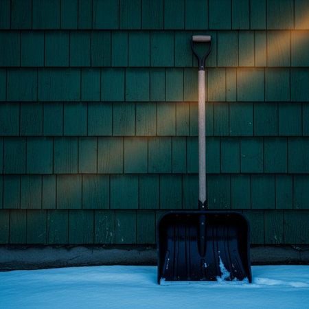 Heavy, decorative snow shovel with textural imperfections leaning against a snow-dusted exterior wal