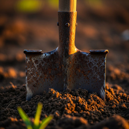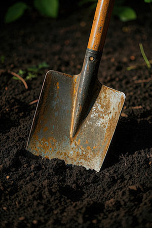 A close-up image of a garden spade inserted into rich brown soil, surrounded by lush green elements, showcasing the beauty of nature and gardening.