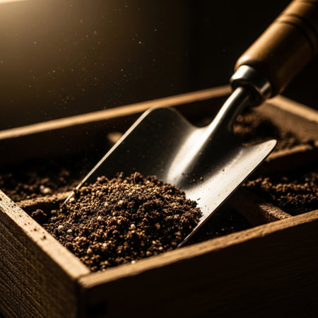 Sunlit garden tools lean against freshly turned earth, their weathered handles awaiting the next phase of planting or outdoor transformation.