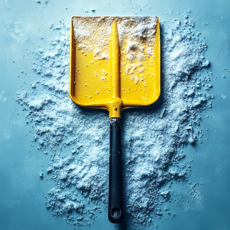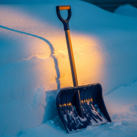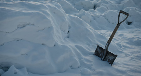 A used D-handle shovel stands embedded in deep, uneven snowdrifts, showing the icy blue and white tones of a frosty winter landscape and the effort of snow removal.