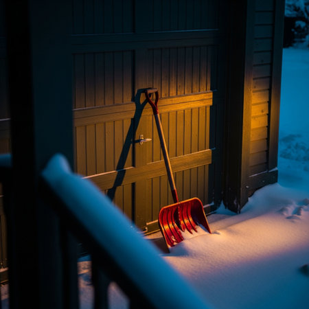Used snow shovel leaning against a dirty garage door, high-angle cinematic view during a blizzard.