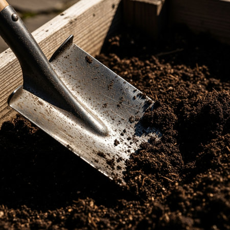 Macro detail of a shovel pushing dark compost into a wooden raised garden bed under harsh sunlight.