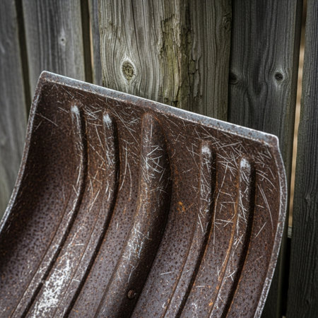 Close-up, square format photograph capturing the textural collision between a worn wooden snow shove