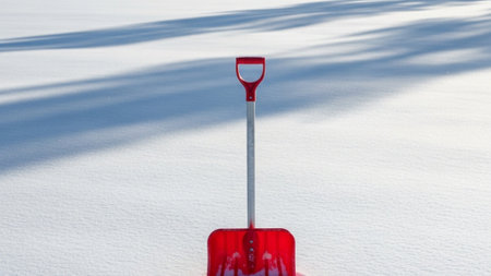 Cinematic wide environmental photograph of a lone, bright red snow shovel standing vertically in an
