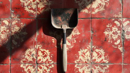 A vintage metal scoop lies on a beautiful red tile floor adorned with a floral pattern, emphasizing texture and rustic charm in an indoor space.