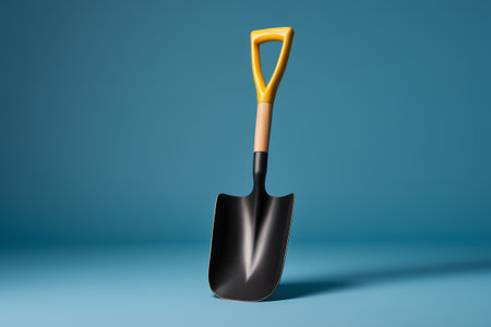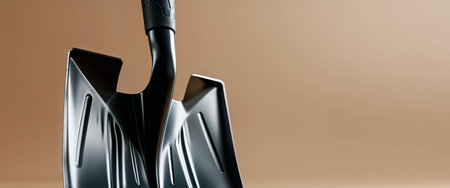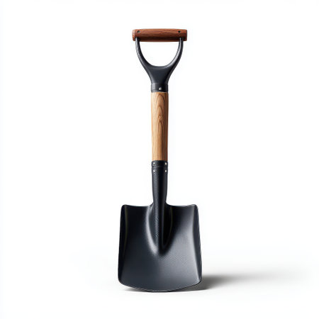 Modern garden shovel with sleek black metal blade and rustic wooden handle isolated on white background for gardening and landscaping projects