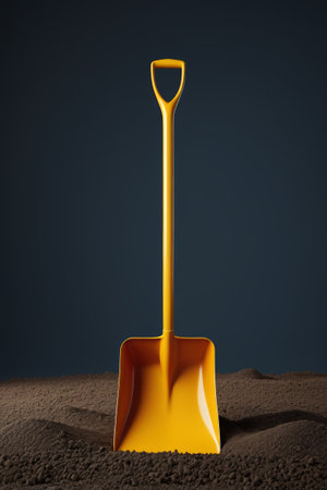 A close inspection reveals a bright yellow garden shovel its blade coated in dark rich soil. The tool is gripped firmly by a hand suggesting its in active use. The backdrop features blurred earth tones emphasizing the gardening activity taking place. This scene captures the essence of outdoor work showcasing the tactile connection between the gardener and the earth
