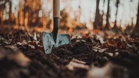 A shovel is stuck in a pile of dirt with bokeh in the background.