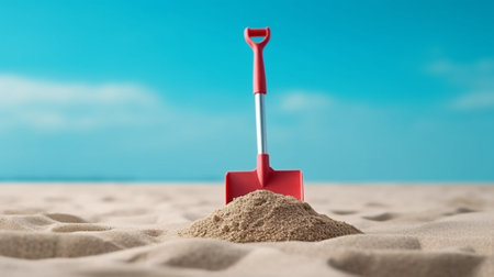 Pink and blue plastic toy spades forgotten on the sand sea coast Summertime Copy space : Generative AI
