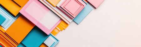 Layered geometric shapes in vibrant colors are arranged on a clean white surface creating a striking aesthetic. The composition invites exploration of color and form ideal for design inspiration.