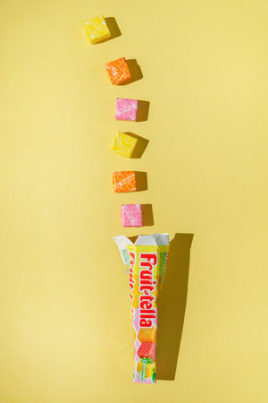 Tyumen, Russia-April 03, 2022: Fruittella cherry sweet made by Perfetti Van Melle, on a yellow background