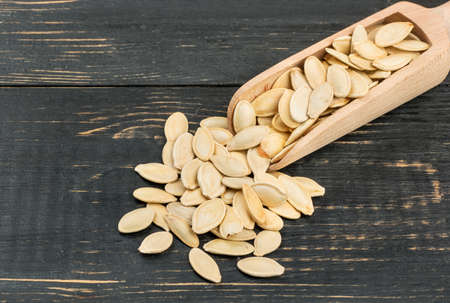 Pumpkin seeds in scoop on wooden background closeup