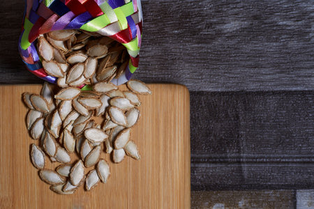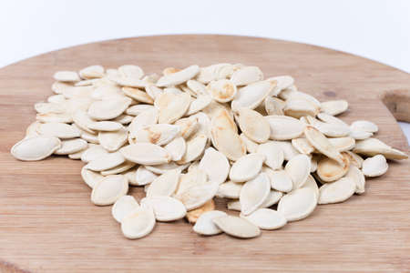 Pumpkin seeds on the wooden board.