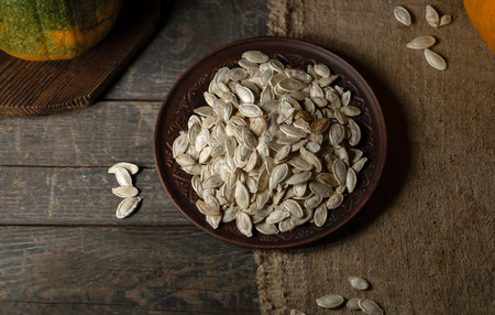 pumpkin seeds on a wooden table. quality photo
