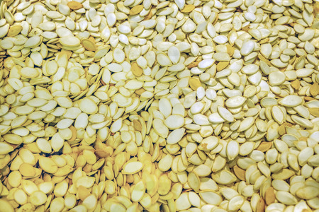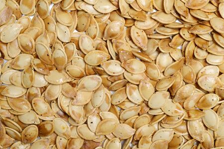 Background of roasted pumpkin seeds close-up view from above.