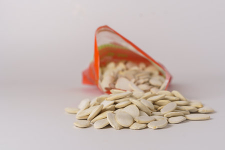 roasted pumpkin seeds with salt coming out of their red bag on a white table with copy space
