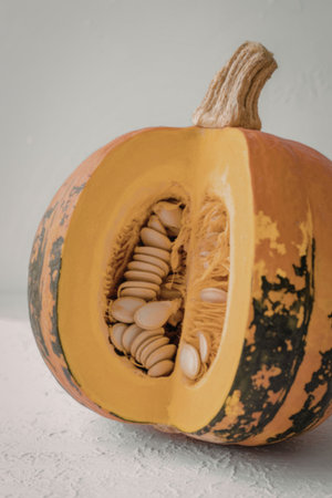 freshly cut orange pumpkin with cooking seeds, preparing orange pumpkin for cooking, pumpkin seeds inside