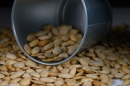 Golden pumpkin seeds spill out of a metal scoop, scattered on a smooth surface, evoking the warmth of autumn harvests. Each seed hints at delicious recipes waiting to be crafted.