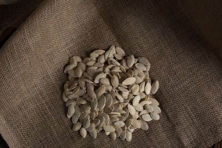 Close up of fresh organic pumpkin seeds on a table, top view or flat lay of tasty healthy food