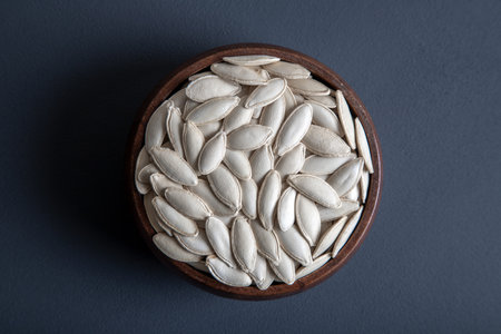 Pumpkin seeds in brown bowl,