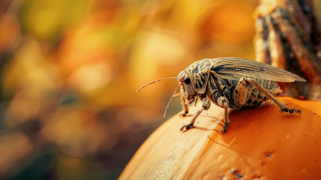 A lively cricket rests atop a bright orange pumpkin, capturing the essence of autumn as golden hues of the changing season surround it. Nature showcases its beauty in this delightful moment.