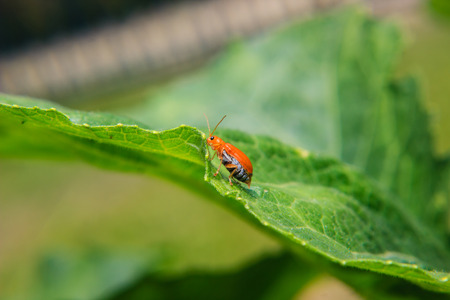 Orange bug on a green leaf in the garden. Macro shot.