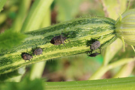 Brown Marmorated shield bug on green Zucchini on plant. Halyomorpha halys insect on zucchini