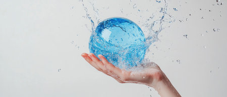 World Water Day concept with a hand holding a blue globe and a splash of clean, fresh liquid on a white background. This banner is suitable for environmental protection advertising or a World Environment Day campaign design. There is ample copy space. High quality, DSLR photo with an f/2.8 lens. --ar 7:3 --v 6.1 Job ID: d7f756fb-d3b0-437c-8a39-400761e7d553