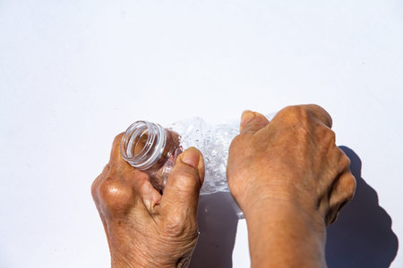Senior woman's hand squashing used plastic bottle, Water drops on transparent soft drink , White background, Light & Shadow, Close up shot, Environment, Global warming, Recycle concept