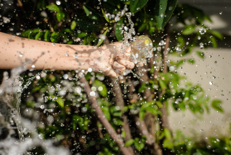 girl hand hold Water balloon explosion with splash water at outdoor natural
