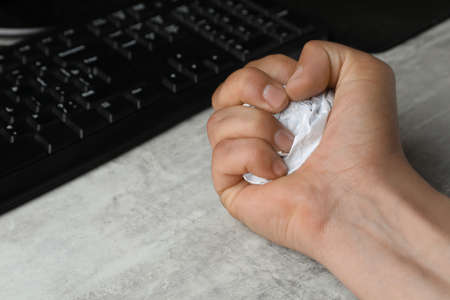 A man crumpled receipt That comes from shopping at a department store Gray cloth background