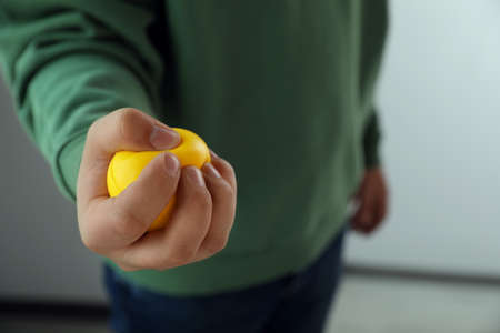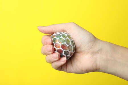 Woman holding colorful slime on yellow background, closeup. antistress toy