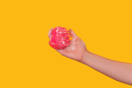 Womans hand with Spiny plastic blue massage ball on pink background. Healthy sport care concept. Copy space
