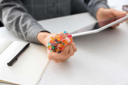 Female hans using pastel color round toy antistress for children and adults on a pink background. Flexible sensory antistress toy pop it round shape, copy space