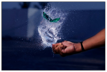 Rain on hand. Close-up of the moment when a stream of rain flows into your hand. Small drops scatter in different directions. Special dark treatment creates the effect of stopping time. Macro photo