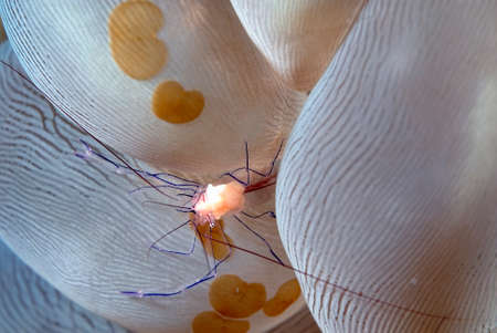 Close-up of comensal shrimp (Periclimenes amethysteus) in its anemone
