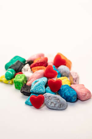 Colorful chocolate candy stones on white background.