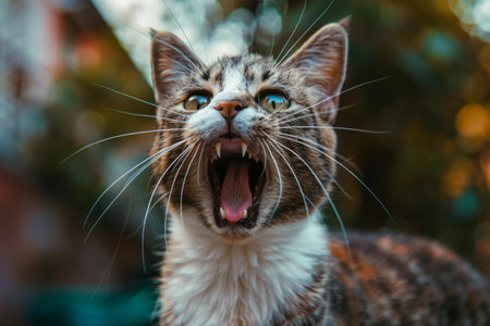 Closeup of a tabby cat with mouth open, as if meowing, against a blurred background