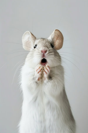 Comical white mouse with a surprised expression on grey background, ideal for educational purposes, humorous content, or pet-related advertising. Copy space for text. Surprised animal. Generative AI.