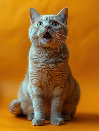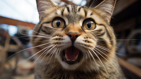 Captivating Image Of A Surprised Cat, Mouth Agape And Eyes Piercing Into The Camera. Concept Surprise Kitty, Feline Expression, Intense Cat Eyes, Startled Pet.