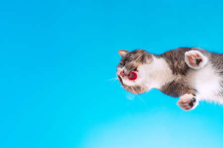 A domestic cat on a blue background. Animal themes. copyspace. A shorthair cat.