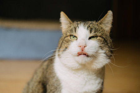 Temperamental british domestic cat looks at you closeup with blurred background.